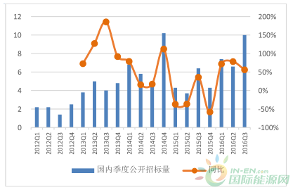 2016 年前三季度累計招標量為 24GW,較去年同期增長68%,創(chuàng)歷史新高。而對比 15年的搶裝現(xiàn)象,14 年同期的招標量僅為17.3GW,而14 年全年的招標量也僅為27.5GW,與今年相比明顯較弱。主要原因是區(qū)域電力企業(yè)及火電企業(yè)由于火電受限,同時風電成本下降投資回報率合理,轉(zhuǎn)型發(fā)展風電所致。