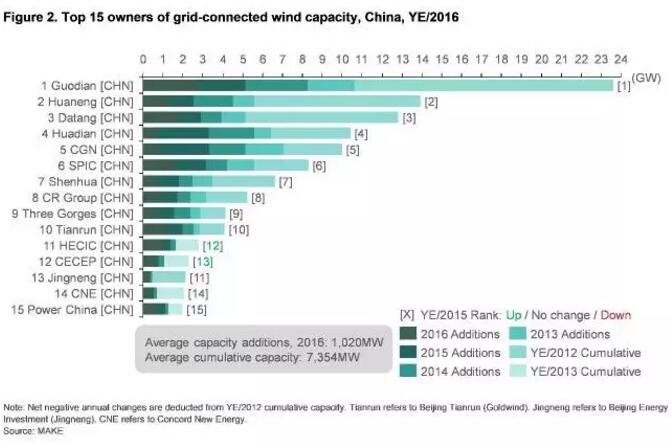 繼2015年的搶裝潮與2016年嚴(yán)峻的棄風(fēng)限電形勢下, 中國傳統(tǒng)能源大省的發(fā)展速度一度放緩,2016年,中國市場的新增風(fēng)電并網(wǎng)容量僅有19.3GW,同比下降34%。2016年,國內(nèi)資產(chǎn)排名前15大業(yè)主的新增容量占比達(dá)到79%,較2015年度的55%有較大提升。三北地區(qū)的棄風(fēng)限電與電價(jià)下調(diào),令部分發(fā)展勢力薄弱的私人業(yè)主或地方性業(yè)主紛紛暫緩開發(fā)新項(xiàng)目,或出于盈利水平的考慮而暫時(shí)退市。