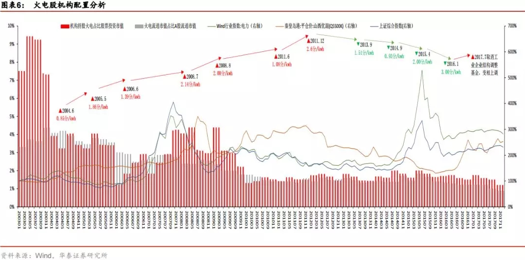 2012 后機(jī)構(gòu)倉位常年在 2%以下。雖然煤價自 2012 年底的 627 元/噸大幅下跌至 2015 年底的 357 元/噸,火電行業(yè)卻因 1)電價多次下調(diào),2)電力供給過剩(火電利用小時數(shù)由 12 年的 4769 小時下降至 15 年的 4357 小時),3)國家大力發(fā)展清潔能源嚴(yán)控火電裝機(jī),行業(yè)整體利潤被壓縮,定價權(quán)嚴(yán)重削弱,機(jī)構(gòu)倉位基本持續(xù)維持在 2%以下。