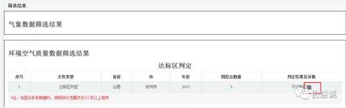 6、篩選結(jié)果顯示在數(shù)據(jù)篩選結(jié)果表中,判定結(jié)果已經(jīng)顯示項(xiàng)目區(qū)域是否達(dá)標(biāo),點(diǎn)擊不達(dá)標(biāo)區(qū)右側(cè)的方塊符號(hào),即可看到具體判定詳情,即當(dāng)?shù)啬甓葷舛葦?shù)據(jù),可用于環(huán)評(píng)報(bào)告中環(huán)境質(zhì)量現(xiàn)狀判定。