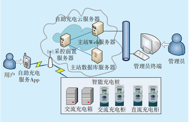 自助充電云服務(wù)器從物理組成上分為主站W(wǎng)eb服務(wù)器、主站數(shù)據(jù)庫(kù)服務(wù)器及采控前置服務(wù)器。主站W(wǎng)eb服務(wù)器與系統(tǒng)管理側(cè)相連,提供管理員對(duì)于充電業(yè)務(wù)的管控;主站數(shù)據(jù)庫(kù)服務(wù)器負(fù)責(zé)處理充電樁的負(fù)荷信息、用戶電量信息、電網(wǎng)負(fù)荷指令及地圖調(diào)用信息等;采控前置服務(wù)器通過無線傳輸與自助充電服務(wù)APP及智能充電樁連接,實(shí)現(xiàn)對(duì)系統(tǒng)各項(xiàng)數(shù)據(jù)的實(shí)時(shí)采集并傳輸充電業(yè)務(wù)的控制指令。