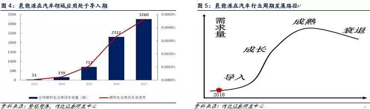 國(guó)際汽車制造商協(xié)會(huì)數(shù)據(jù)顯示,2017年全球銷售乘用車接近0.71億輛,而勢(shì)銀智庫(kù)數(shù)據(jù)顯示2017年全球FCV(燃料電池汽車)銷量3260輛(燃料電池汽車大多使用氫能源作為燃料,極少數(shù)使用其他燃料,在此暫且先認(rèn)為這些FCV都使用了氫氣做燃料),氫能源在汽車領(lǐng)域滲透率不過(guò)0.0046%,在汽車應(yīng)用領(lǐng)域氫能源產(chǎn)業(yè)化尚處于導(dǎo)入期。