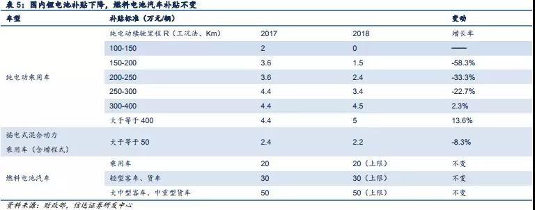 國(guó)內(nèi)方面補(bǔ)貼政策最早是在2009年出現(xiàn),主要形式是免征購(gòu)置稅,同時(shí)還會(huì)在購(gòu)買時(shí)給予一次性的不同額度的補(bǔ)貼。從補(bǔ)貼力度看,我國(guó)的補(bǔ)貼力度是最大的,按2017年標(biāo)準(zhǔn),僅乘用車補(bǔ)貼就高達(dá)20萬(wàn)元/輛,高于日韓22000美元/輛的標(biāo)準(zhǔn),大型客貨則高達(dá)50萬(wàn)元/輛,遠(yuǎn)超出國(guó)外最高額度。2018年補(bǔ)貼有所調(diào)整,原來(lái)對(duì)應(yīng)的20、30、50萬(wàn)元/輛,分別調(diào)整為對(duì)應(yīng)補(bǔ)貼上限。