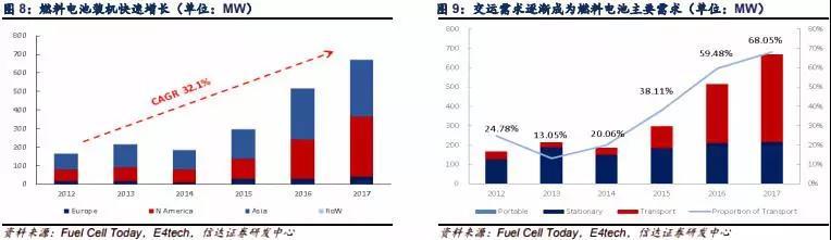 FuelCell Today和E4tech數(shù)據(jù)顯示,燃料電池裝機(jī)逐年增長(zhǎng),2012年-2017年復(fù)合增長(zhǎng)率達(dá)到32.1%,其中交通運(yùn)輸領(lǐng)域的應(yīng)用比例逐年上升,2017年交運(yùn)領(lǐng)域的裝機(jī)占比已經(jīng)達(dá)到68.05%。交運(yùn)領(lǐng)域的需求已經(jīng)成為燃料電池主要需求,也是氫能源的主要需求。