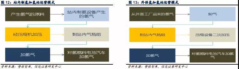未來(lái)在氫氣制取環(huán)節(jié),會(huì)存在兩種運(yùn)營(yíng)形式。第一種是中央制氫,典型的運(yùn)營(yíng)模式是在城市周邊地區(qū)建設(shè)大規(guī)模氫氣生產(chǎn)廠,然后通過(guò)運(yùn)氫車將氫氣運(yùn)輸?shù)匠鞘兄械募託湔?,再由加氫站出售給消費(fèi)者。第二種是分布式制氫,城市中的加氫站在站內(nèi)裝有氫氣發(fā)生器,實(shí)現(xiàn)氫氣生產(chǎn)、壓縮、儲(chǔ)存、出售一體化,或者在應(yīng)用端直接安裝氫氣發(fā)生器,實(shí)現(xiàn)應(yīng)用端自產(chǎn)自供氫氣。我們認(rèn)為,未來(lái)中央產(chǎn)氫和分布式產(chǎn)氫兩種形式并存較為合理。