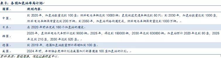 目前,為了支持燃料電池汽車發(fā)展,各國(guó)積極建設(shè)氫能源燃料電池汽車配套設(shè)施。根據(jù)規(guī)劃,到2020年,中國(guó)將建成100座加氫站,到2030年將建成1000座加氫站,日本在2020年前建成160個(gè)加氫站,韓國(guó)計(jì)劃到2020年建成80座加氫站,德國(guó)到2020年也預(yù)計(jì)達(dá)到100座加氫站的規(guī)模。世界上幾個(gè)建設(shè)加氫站的大國(guó)都以2020年100座加氫站為目標(biāo)。而截至2017年底我國(guó)加氫站共有9座,北京、上海各2座,深圳、廣州各1座,還有一座移動(dòng)加氫站,另外2座歸屬新源動(dòng)力和宇通客車,這距離我國(guó)2020年100座加氫站的目標(biāo)還有很大距離,同時(shí)也表明,未來(lái)兩年內(nèi)加氫站建設(shè)進(jìn)度會(huì)急劇增加,相關(guān)方面需求巨大,也是機(jī)會(huì)點(diǎn)。
