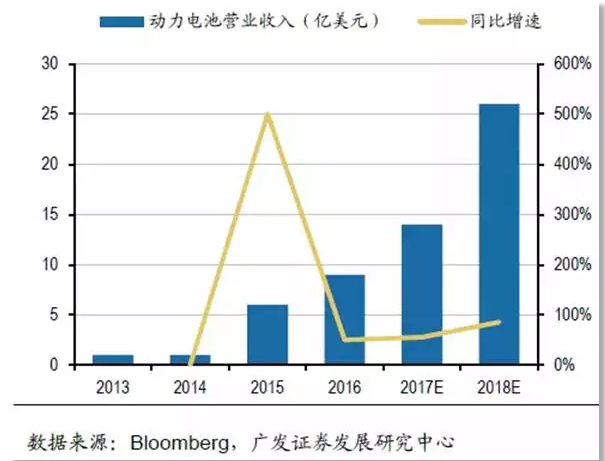 對比往年數(shù)據(jù),今年LG化學(xué)動(dòng)力電池出貨量及營業(yè)收入穩(wěn)中有升。有研究機(jī)構(gòu)預(yù)測,其在2018年將迎來較大增長,且看下圖:
